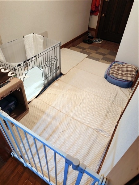 約6年、玄関でむぎと一緒に寝ていたときは、マトレスを敷き、洗えるおねしょシーツなどを敷き詰めていた。