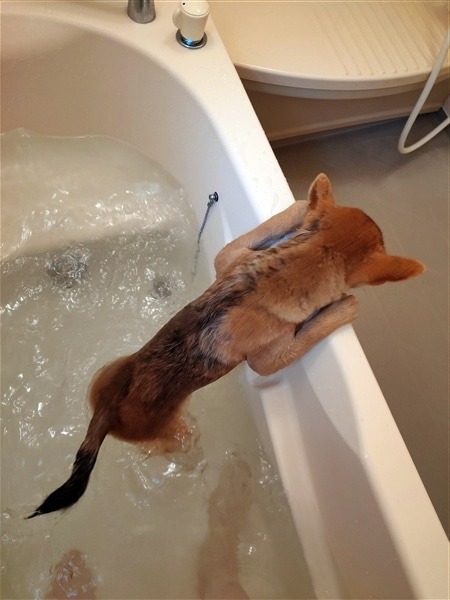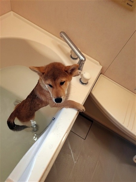 柴犬2ヶ月と21日 ブリーダーさんのところで1週間前に入浴を済ませてきたはずなのに、尿臭や便臭ではなく、体臭なのか、とても臭かったのでとりあえず我が家での初入浴!浴槽の腰掛部分?くらいまでお湯を張り、重炭酸を入れて入浴させた。体臭だったとし...