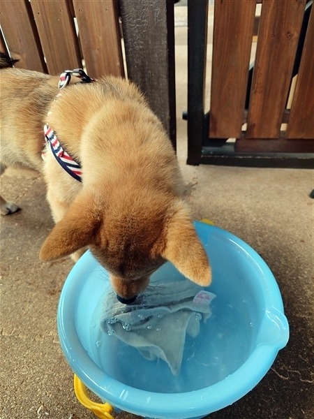 柴犬パピー生後116日 足のダシがお好き? 2025.11.18 生後116日 16週4日 3ヶ月24日 うちにきて40日 2025年10月31日 ごましゃん、5.8㎏ 足を洗ったバケツのお湯を毎回飲んでいる。 先代のむぎも同じだったなぁ・・・・