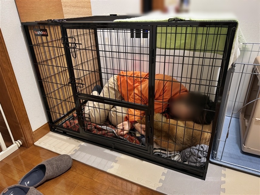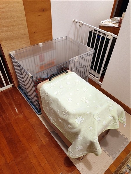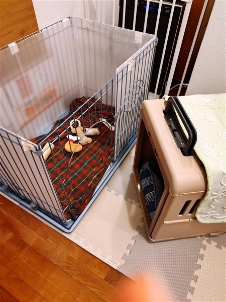 こうやってクレートとサークルをつないで、寝床と遊び場(トイレ)をわけている。