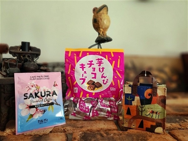カルディのSAKURAフレーバーコーヒー、芋けんぴチョコキューブ、エコバッグ伝説柄ミニミニミニクランチ